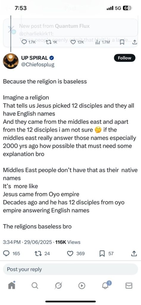 “Because the religion is baseless. Imagine a religion that tells us Jesus picked 12 disciples and they all have English names. And they came from the Middle East, and apart from the 12 disciples I’m not sure if Middle East people really answer those names — especially 2,000 years ago. How possible? That must need some explanation, bro. Middle East people don’t have that as their native names. It’s more like Jesus came from the Oyo Empire decades ago and had 12 disciples from Oyo answering English names. The religion is baseless, bro.”