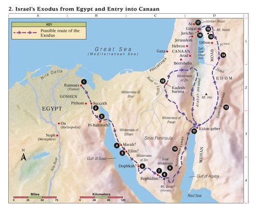 To illustrate the full route, here’s a map of the traditional Exodus path, showing the journey from Egypt through Sinai and into Canaan: